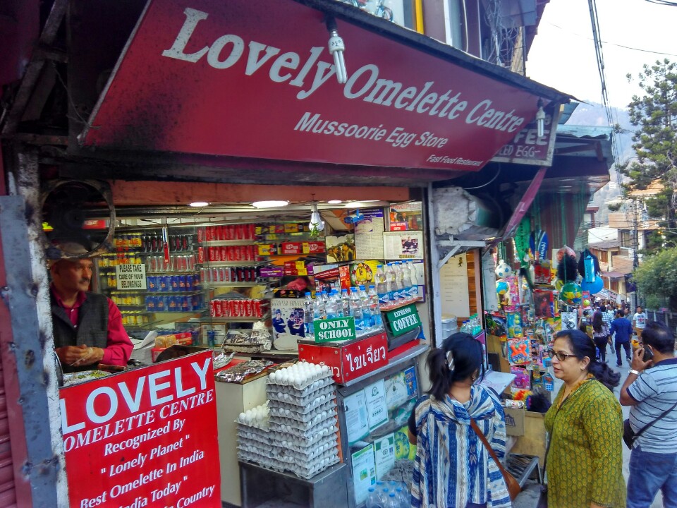 Like every other hill station, Mussoorie too has the mandatory Mall Road, which is actually the main shopping street. The quaint hill town street is quite narrow, with shops lining up both the sides, and traffic is restricted on this street. Of course, we did not have any shopping in mind and just took a leisurely stroll to the end of the road, starting from Picture Palace side and ending at the Library. The ladies with us, nevertheless, did stop at a Tibetan curio shop to buy junk jewellery, which can be found in abundance there. The road is lined with dozens of food outlets, catering to the taste of all kinds of tourists. One outlet worth mentioning here is a tiny shop selling omelettes, Lovely Omelette Center. It caught our attention because there were little several posters there highlighting the fact that the place was recommended on Trip Advisor as well as Lonely Planet. We decided to give it a try and had to wait for a while to get our cheese omelette, as the stall owner gives priority to orders of school kids’ orders. Well, the omelette was worth the wait with delicious melted cheese oozing out from all sides. Yummy !